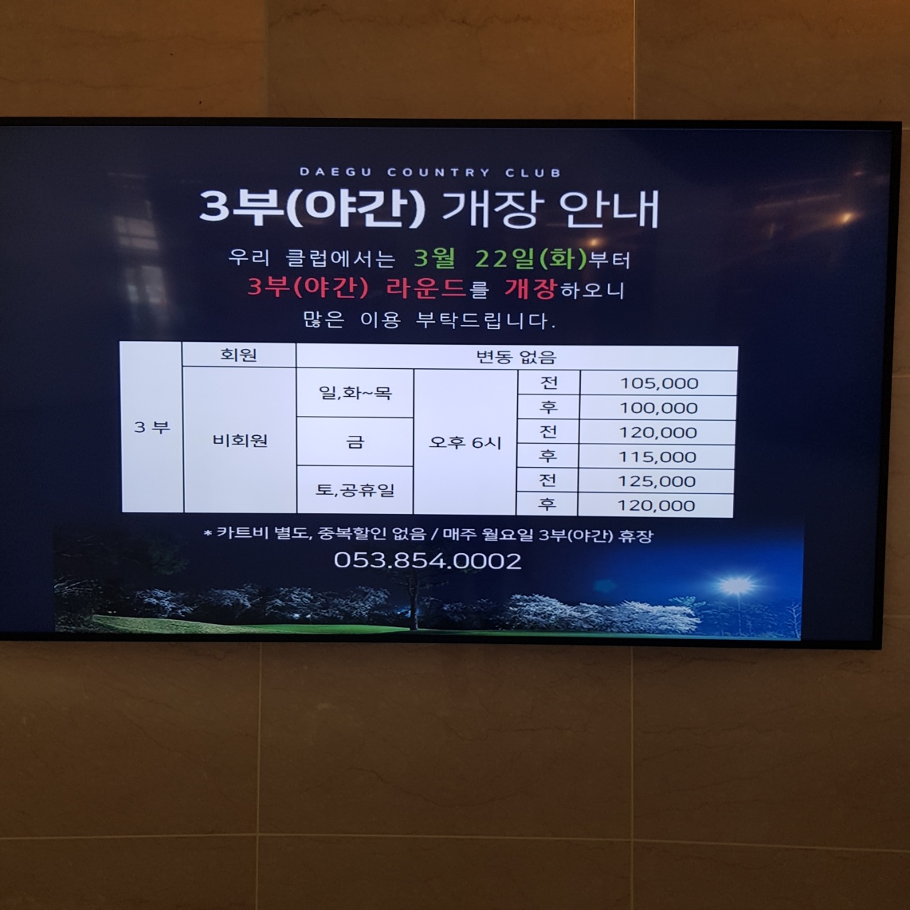 3월 22일부터는 3부(야간) 라운드 개장되어 상대적으로 평일 및 주말에 비해 저렴한 가격으로 라운드를 즐길 수 있게 되었습니다. 스타트하우스로 가기 전 그린 스피드 등을 체크할 수 있는 모니터가 설치되어있습니다.